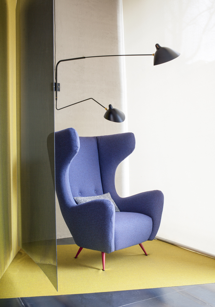The fabric company Kvadrat commissioned Studiopepe to conceptualize an exhibition for the Italian launch of its new collection of textiles designed by Raf Simons. The Studio deftly juxtaposed the softness of the fabrics with the luster of plexiglass, the hardness of metal, and the unique textures of linoleum.