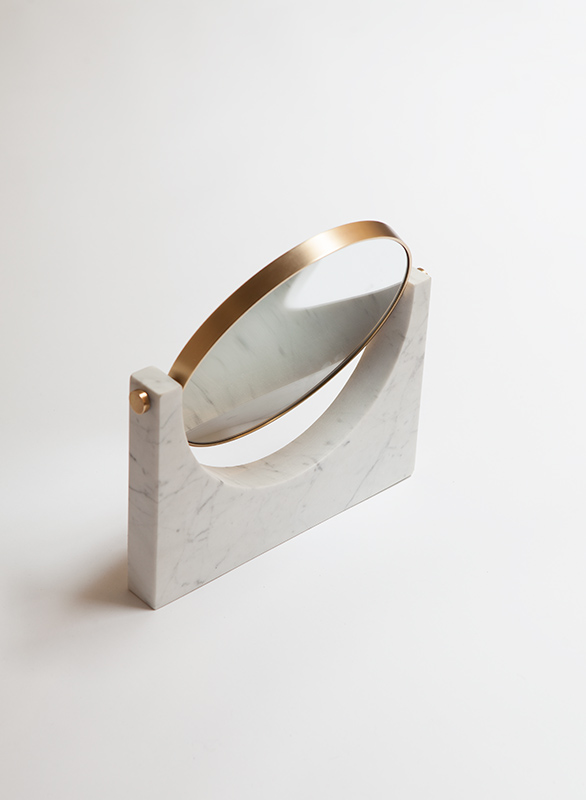 Revolving Moon is a wall mirror inspired by the movements of the moon phases. The metal bar houses a magnifier adjustable in different positions.