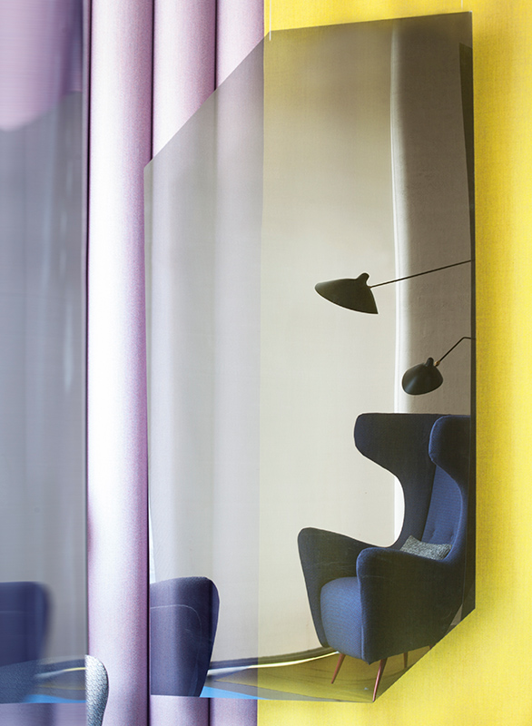 The Studio envisioned a single plywood wall that would span all three floors of the showroom and feature a geometric motif inspired by the historic patterns of Arne Jacobsen, reinterpreted in a palette of cool color tones. The capsule room, designed to house special projects, was entirely coated in acid yellow, undergoing a metamorphosis that turned the space into a landmark that engages the viewer even from the building’s exterior.