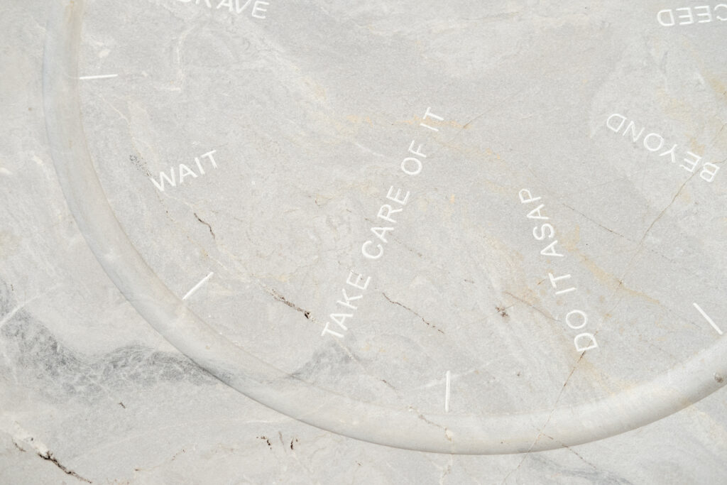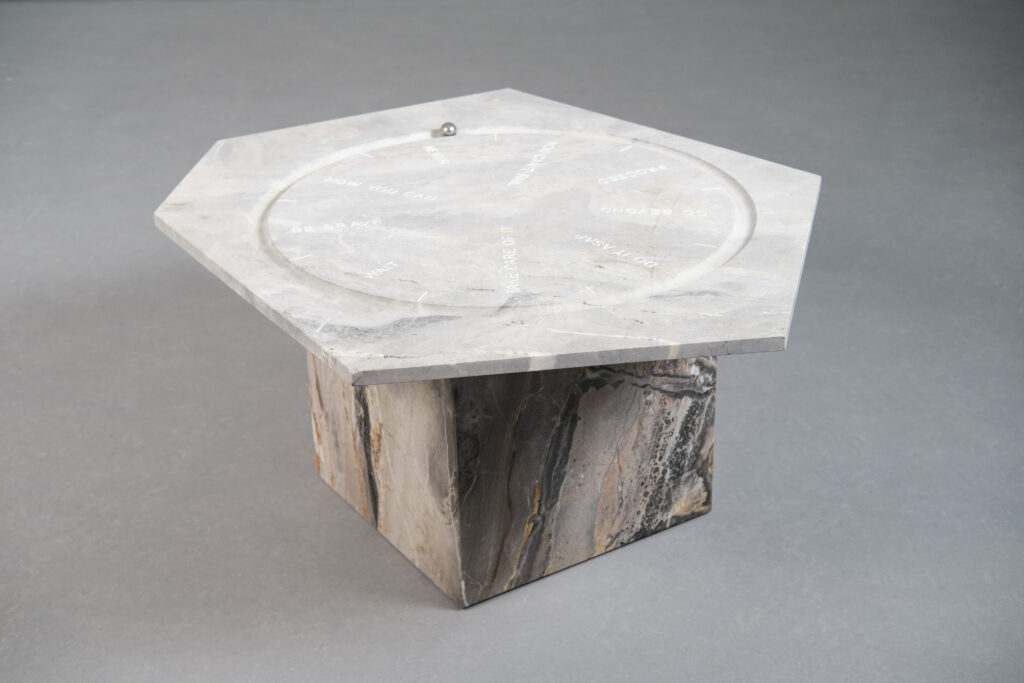Studiopepe designed a coffee table concieved as a divination game. Within this project, when the metal sphere is tossed twice, its dual responses, which may occasionally conflict, will suggest which theme warrants reflection.