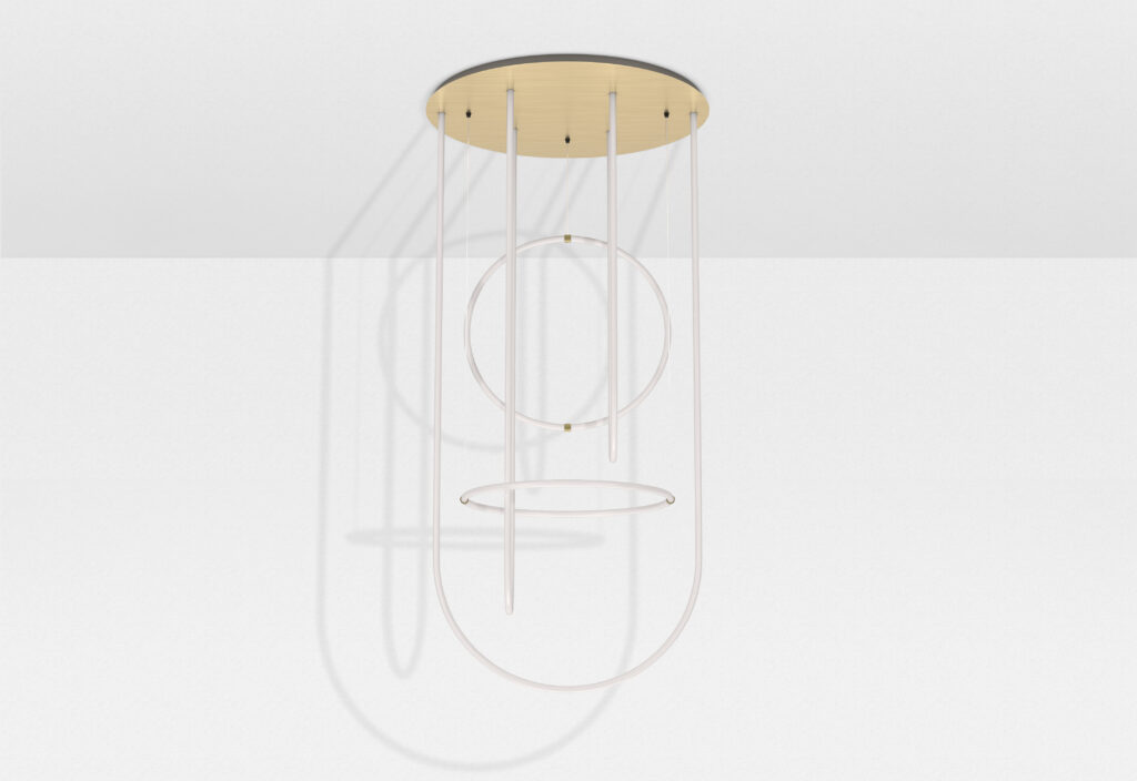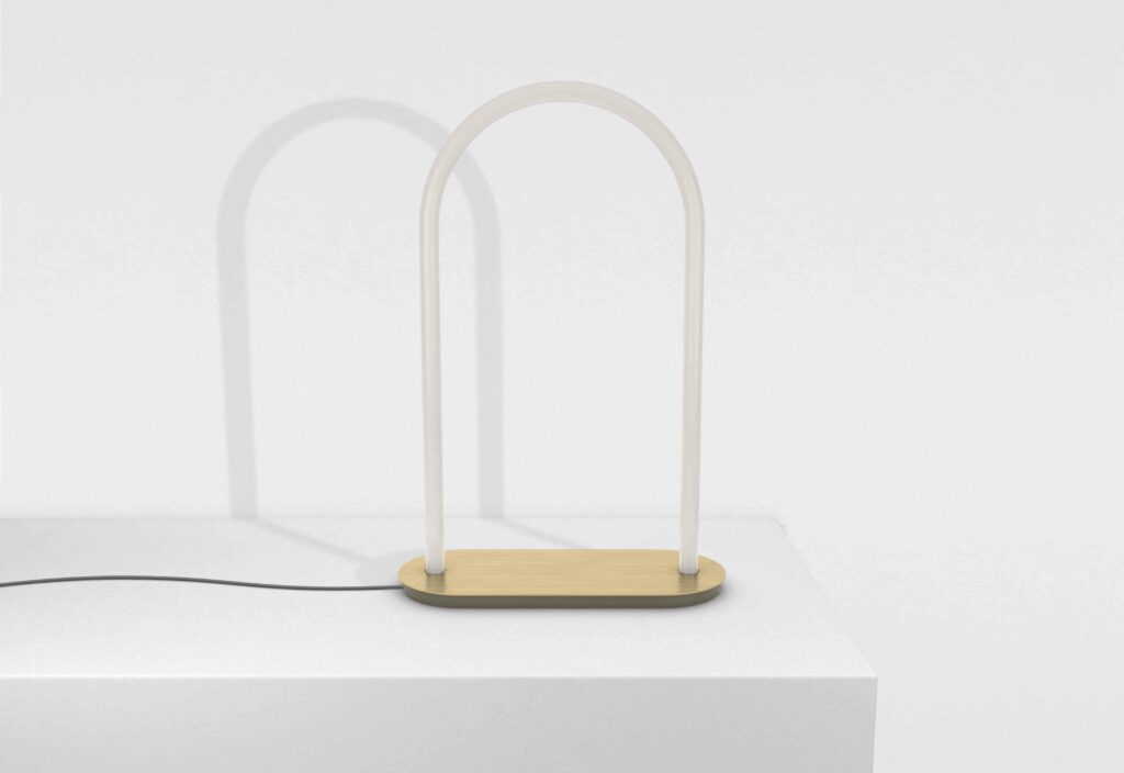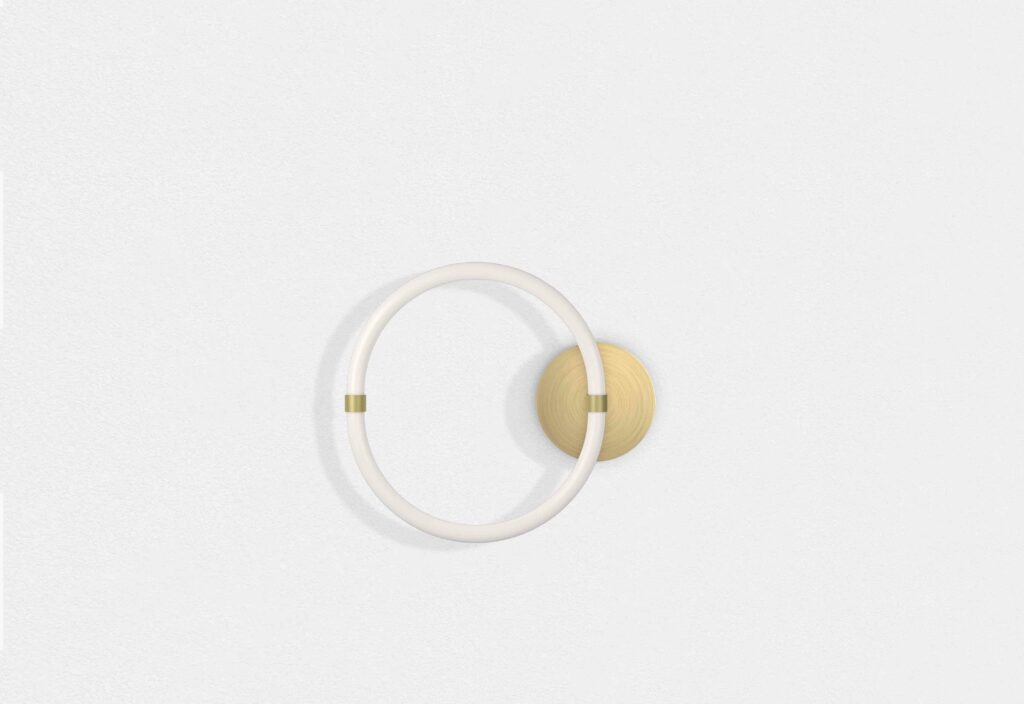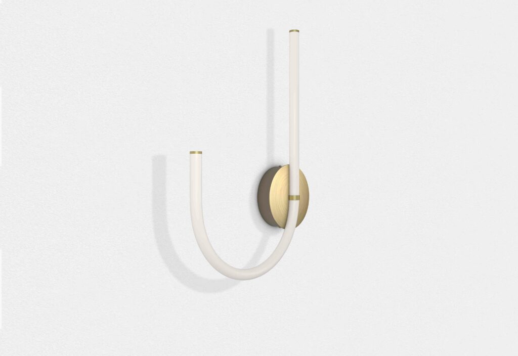 A unique system of curved, modular LED tubes that can be paired in endless combinations. The brass, which covers the pieces, gives a delicate and classy, sublimated and expressed in total purity through an aesthetic rendering faithful to that of neon.